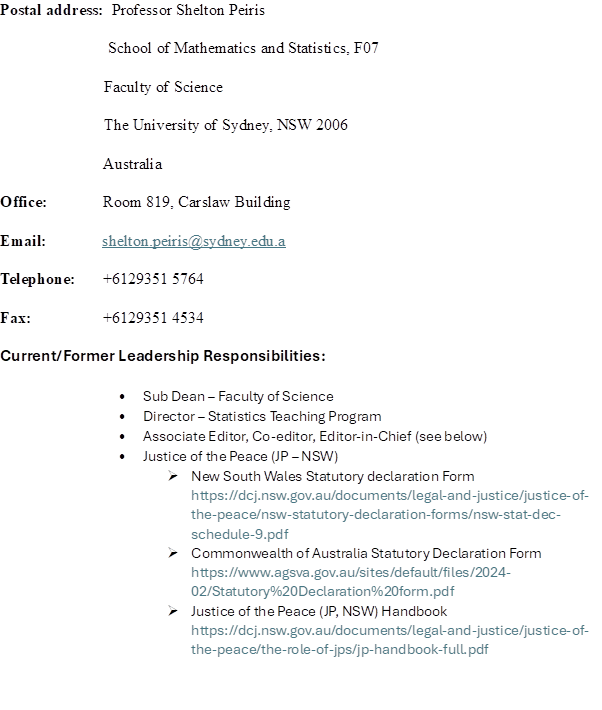 Shelton Peiris did his PhD at Monash University, Melbourne, Victoria. After graduation from Monash in 1987, he lectured at the University of Moratuwa and the University of Melbourne before joining what was then the Department of Statistics in 1990. He has been here ever since except for visiting appointments at the University of Waterloo (1993), the University of Manitoba (1997), the University of Iowa (1997), Thaksin University (1998), Pennsylvania State University (2002) and the University of Malaya (2007).